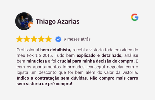 A Consultoria Completa da Vistorias Cars é ideal para quem não tem tempo ou não sabe por onde começar na hora de escolher um carro. Através de uma vídeo chamada personalizada, entendemos seu perfil, necessidades diárias e faixa de preço, para buscar o modelo ideal. Fazemos vistorias completas em cada veículo analisado e só indicamos quando encontramos uma opção que realmente vale a pena. Nosso foco não é velocidade, e sim garantir que você compre um carro seguro, confiável e sem prejuízos.