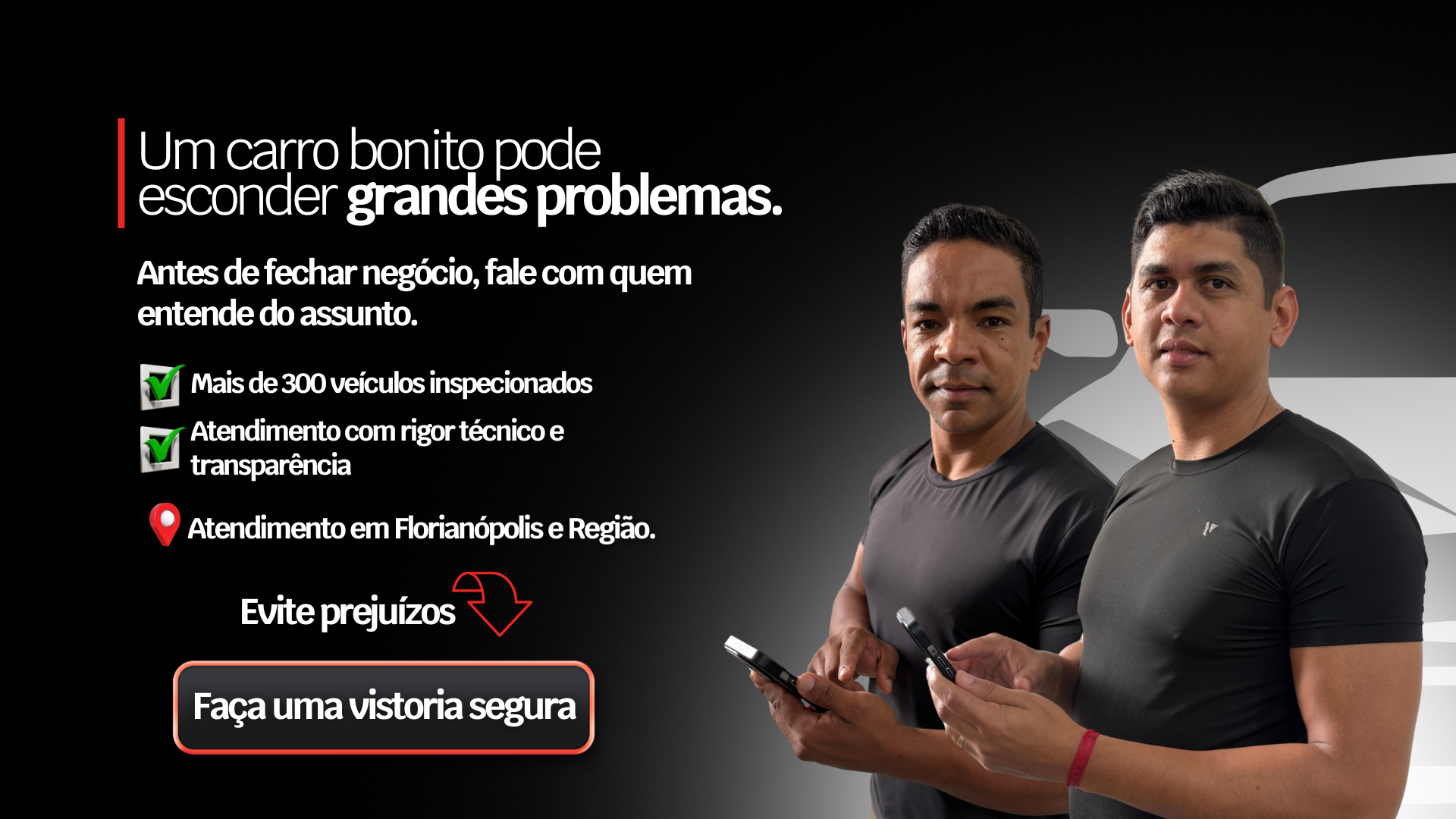 Atendemos Florianópolis e Região, equipe própria e especializada, garantindo um serviço rápido, preciso, de alta qualidade e confiança. Vamos até o local aonde o veículo está — seja em residências, lojas ou concessionárias — levando toda a estrutura necessária para realizar uma vistoria completa e detalhada, com envio de vídeos em tempo real. Com a gente, você tem praticidade e segurança em cada etapa da negociação.